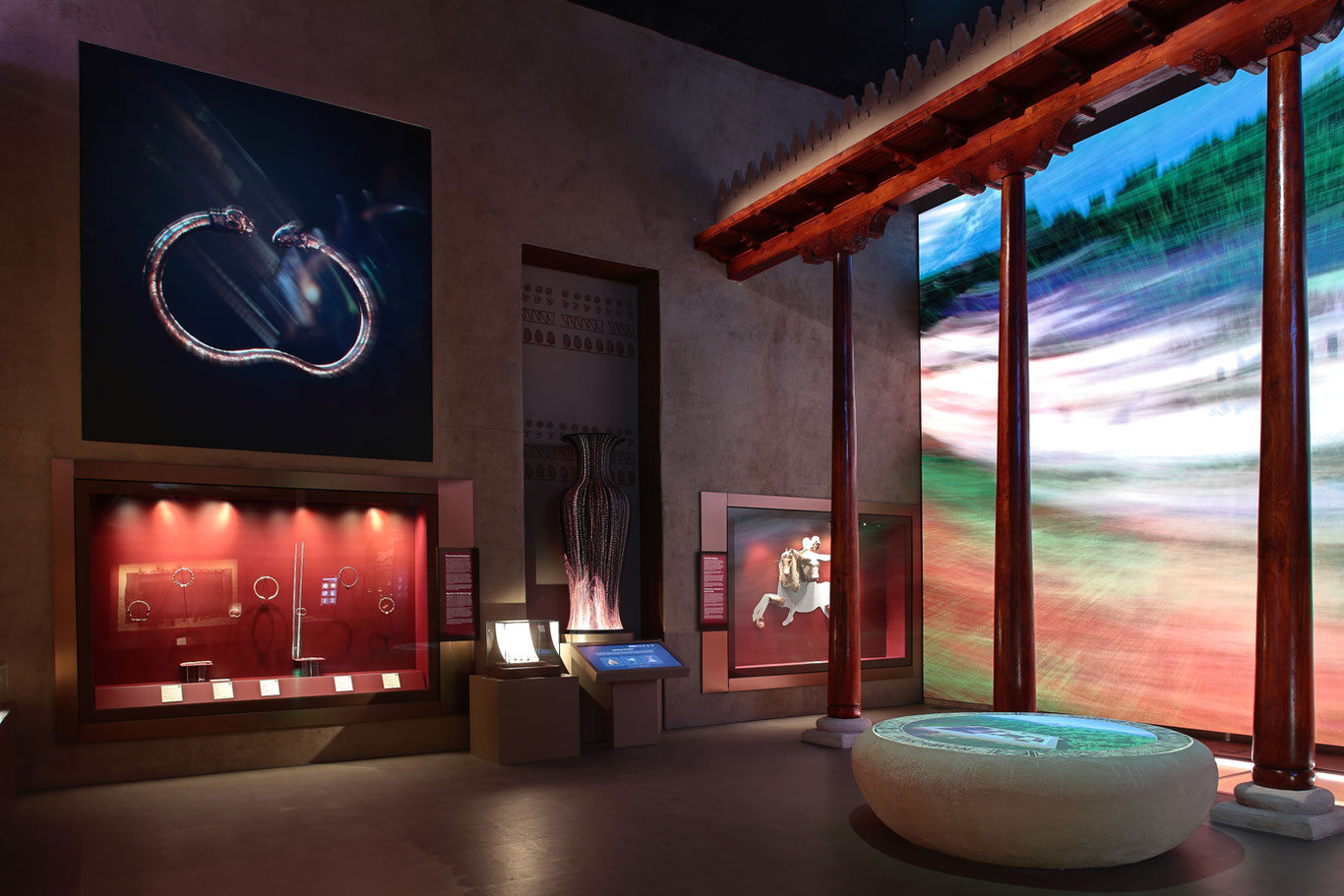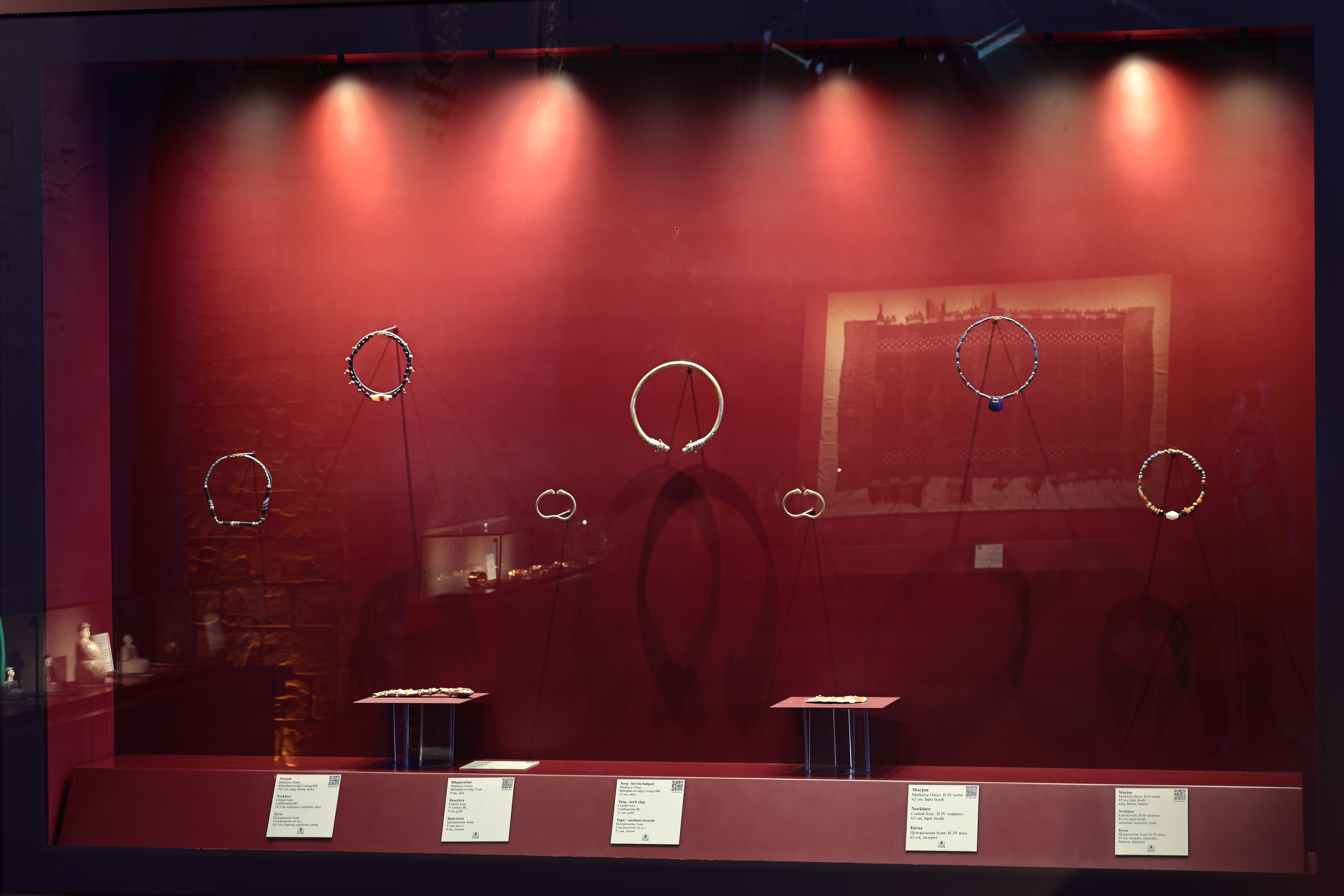 Золотые браслеты, представленные в экспозиции, считались в бактрийском обществе одним из основных символов социального статуса и богатства. Эти украшения из чистого золота были инкрустированы полудрагоценными камнями — агатом, бирюзой и лазуритом. Они служили не только предметами украшения, но и символами могущества, власти и благополучия.