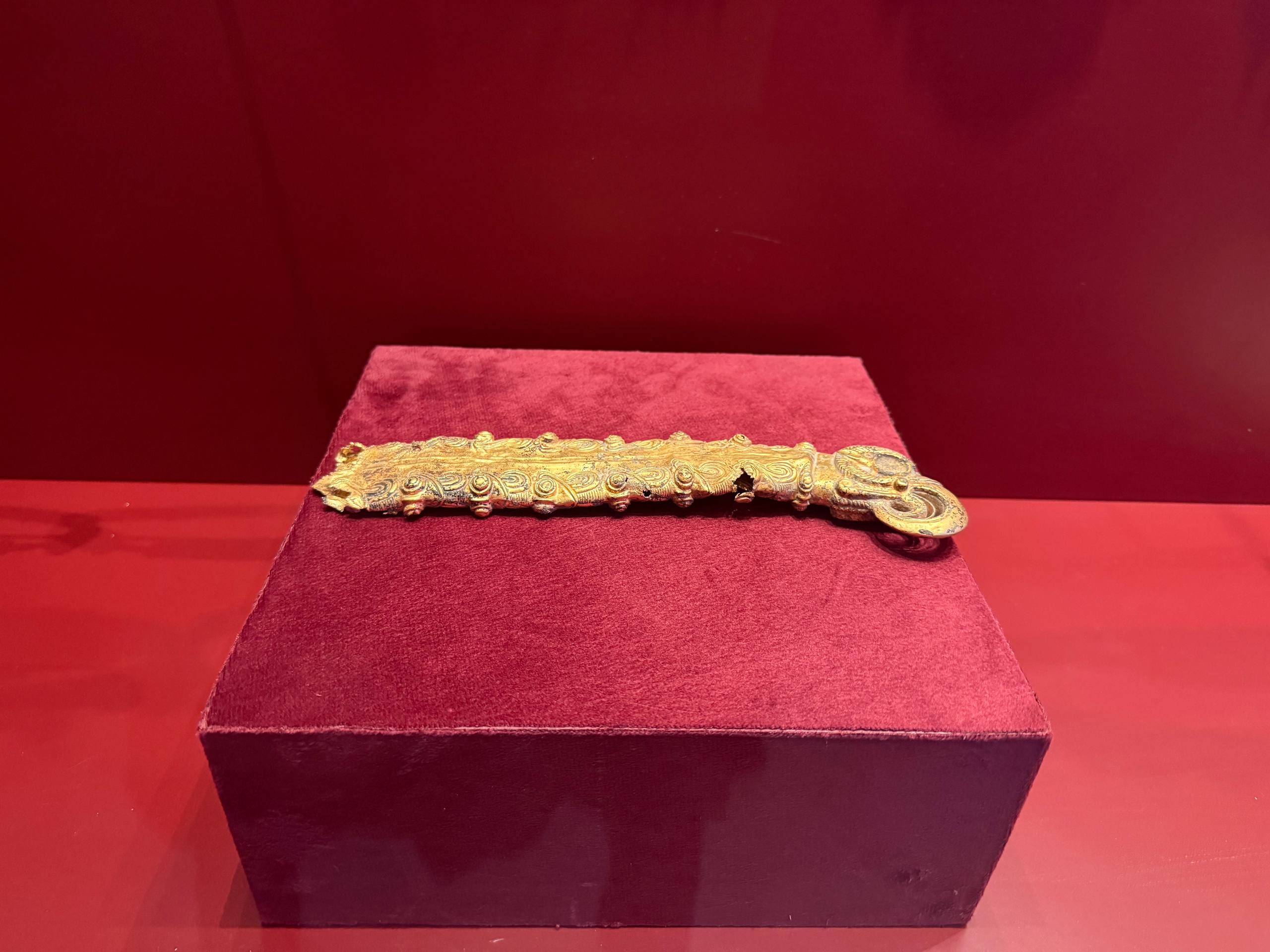 Одним из самых редких экспонатов является золотые ножны для ножа, датируемые IV веком до нашей эры. Они отражают исторические процессы, связанные с эпохой Ахеменидов и походами Александра Македонского. Изображения животных и мифологических образов на поверхности ножен демонстрируют гармоничное переплетение традиций сакского, согдийского и бактрийского искусства.