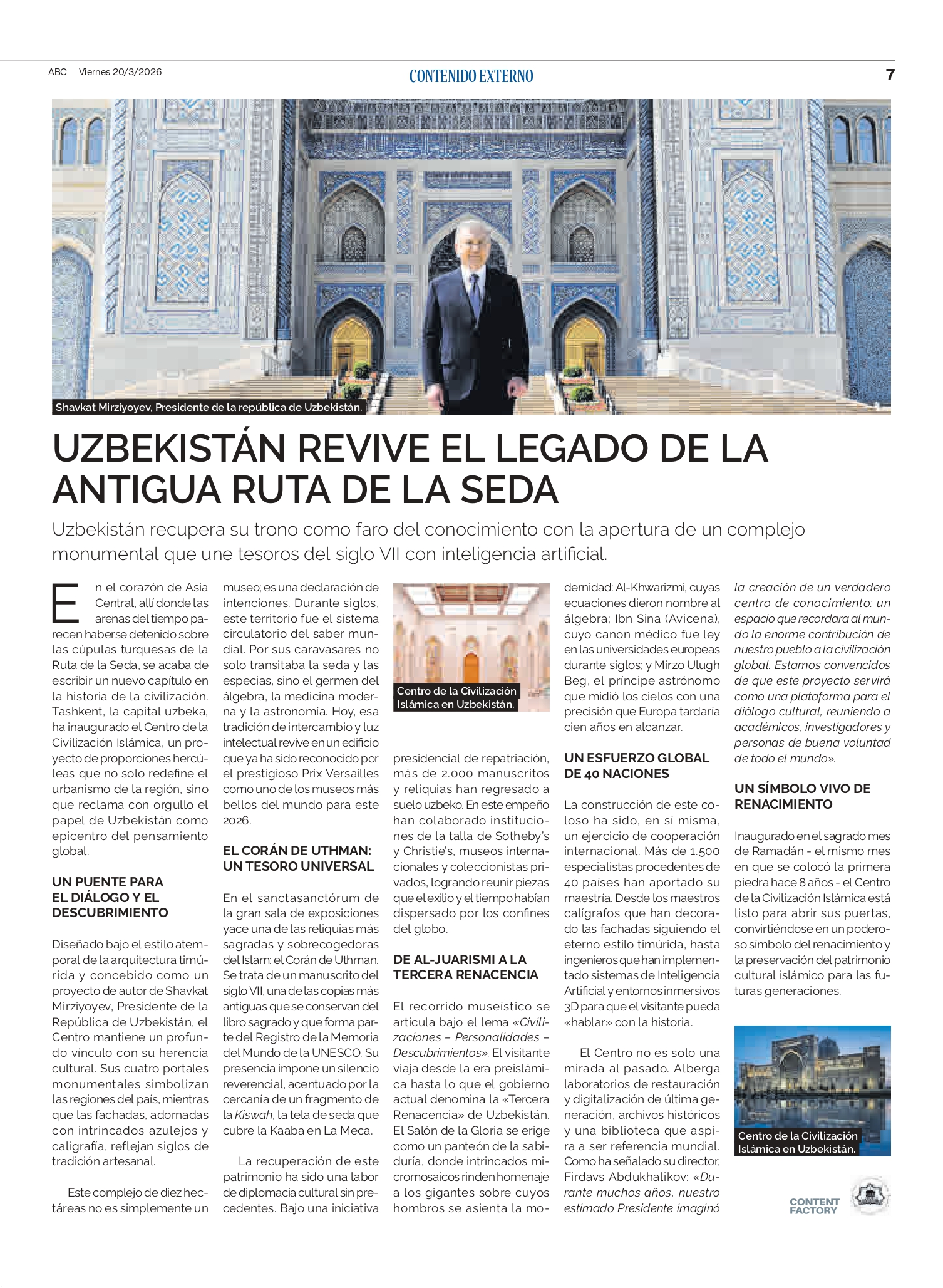 Нуфузли Испаниянинг АБC газетасида эълон қилинган мақолада таъкидланишича, Тошкентда очилган Ислом цивилизацияси маркази Буюк Ипак йўлининг бой меросини замонавий технологиялар билан уйғунлаштирган йирик маданий-илмий лойиҳа ҳисобланади. Марказ халқаро миқёсдаги диққат марказига айланиб, унда маданият, илм-фан ва замонавий ғоялар туташади ҳамда цивилизациялар ўртасидаги мулоқот учун янги имкониятлар очади. Шу билан бирга, у Ўзбекистоннинг жаҳон тараққиётига қўшган ҳиссасини қайта англашга хизмат қилади.
