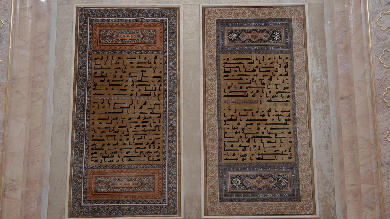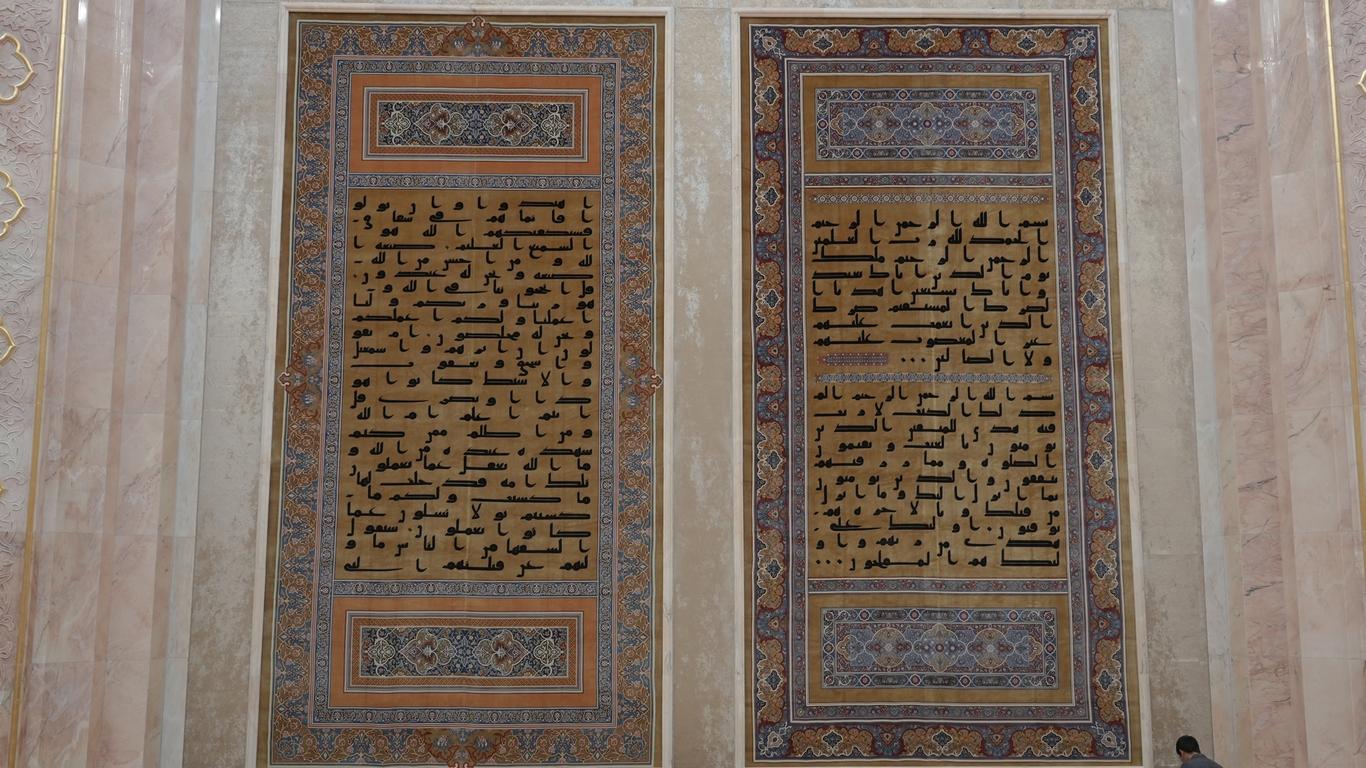 Зал Священного Корана расположен в самом центре комплекса и является его духовным сердцем. Здесь бережно хранится один из древнейших в мире экземпляров Священного Писания — Коран Усмана (да помилует его Аллах). Этот уникальный мусхаф состоит из 338 листов, написанных крупным куфическим письмом в 12 строк на каждой странице. Для страниц использована тонко выделанная кожа, сохранившаяся до наших дней.