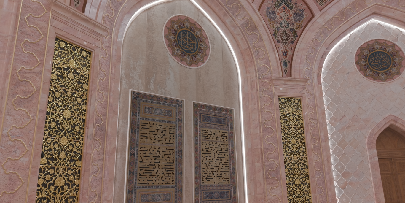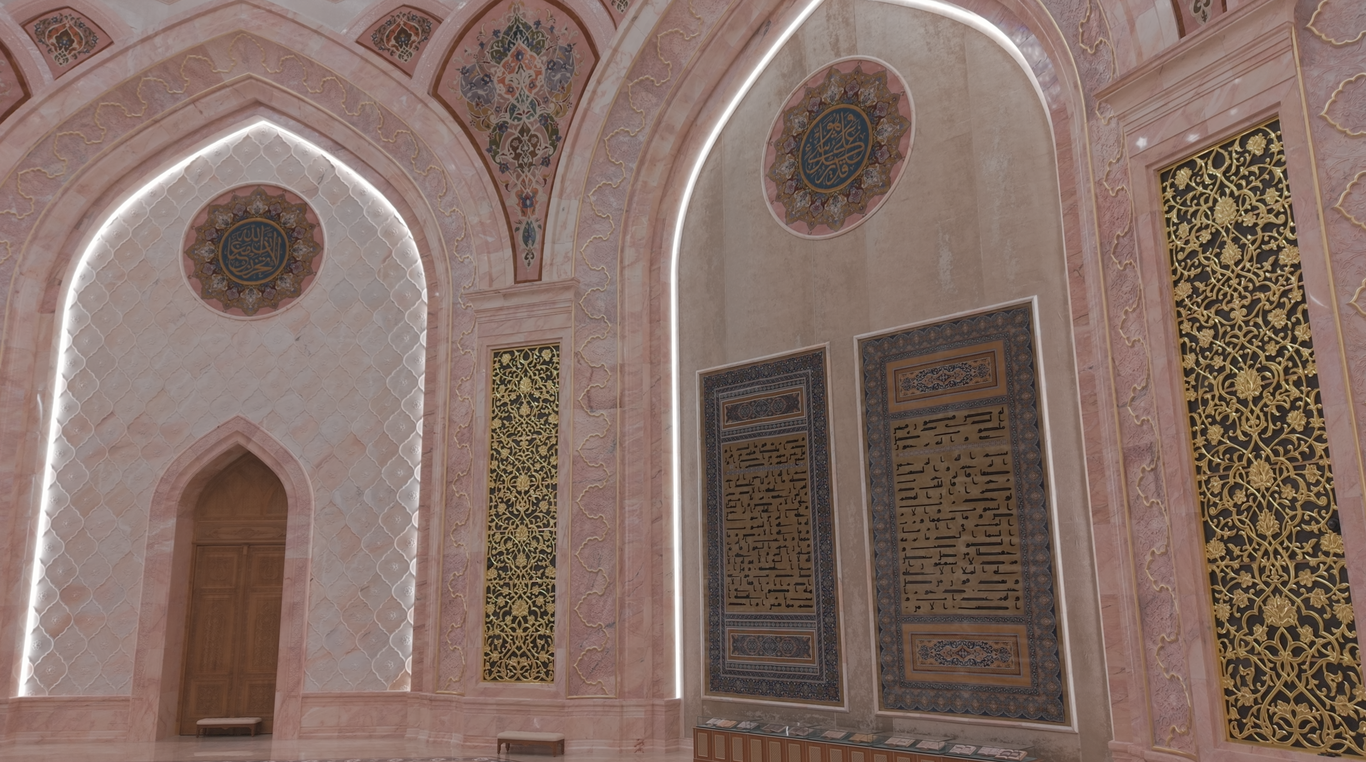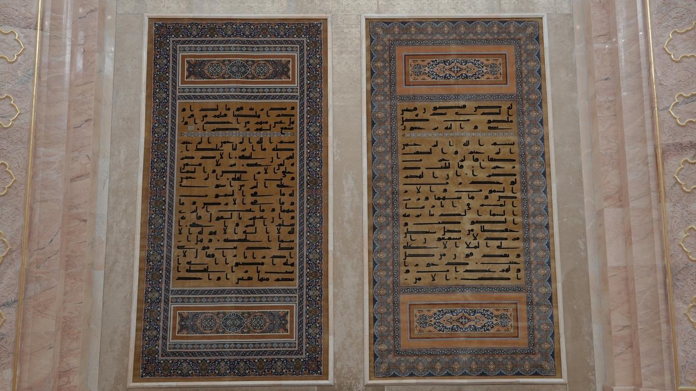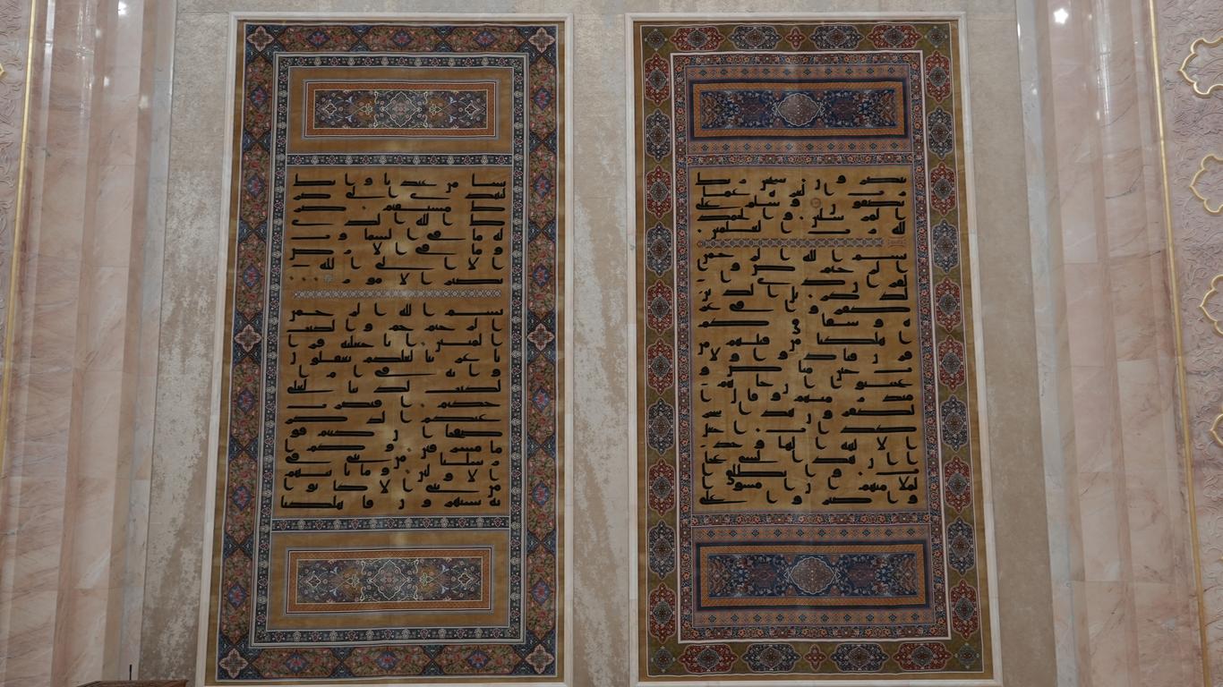 Особое художественное решение зала составляют восемь шёлковых ковров, на которых вручную вытканы аяты из Корана Усмана. Их сияние и тонкость исполнения создают атмосферу духовного величия, тишины и благоговейного созерцания, приглашая каждого посетителя ощутить связь времён и прикоснуться к сердцу исламской цивилизации