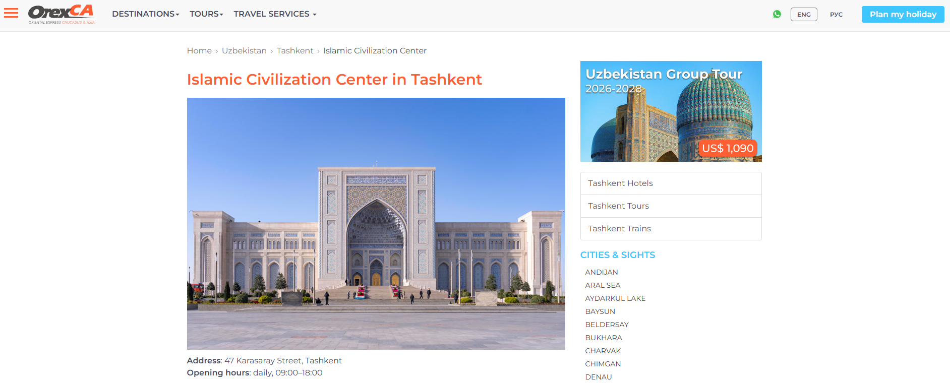 Сайт Orexca, специализирующийся на путешествиях по Узбекистану и Центральной Азии, уделяет особое внимание Центру исламской цивилизации в Ташкенте. В публикации подчёркивается, что это один из крупнейших культурно-научных проектов XXI века, в котором многовековое наследие интегрировано с современными технологиями. Центр выполняет функции музея, образовательной площадки и пространства международного диалога.