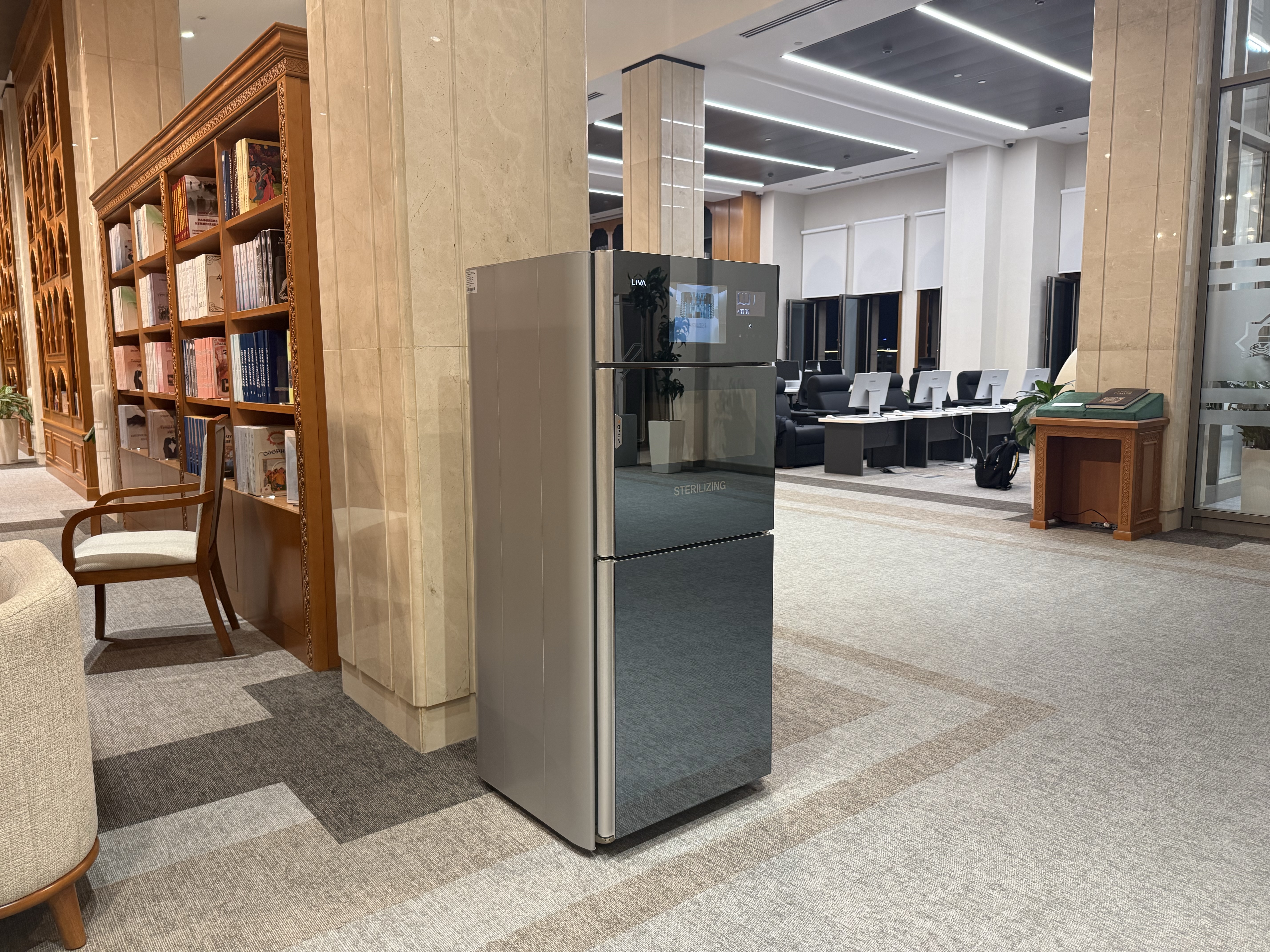 В современных библиотеках внедрение технологий, соответствующих гигиеническим требованиям, приобретает особое значение. В качестве одного из таких инновационных решений в библиотеке Центра установлены стерилизаторы книг модели LIVA LBS601, разработанные южнокорейской компанией Evertree Co., Ltd.