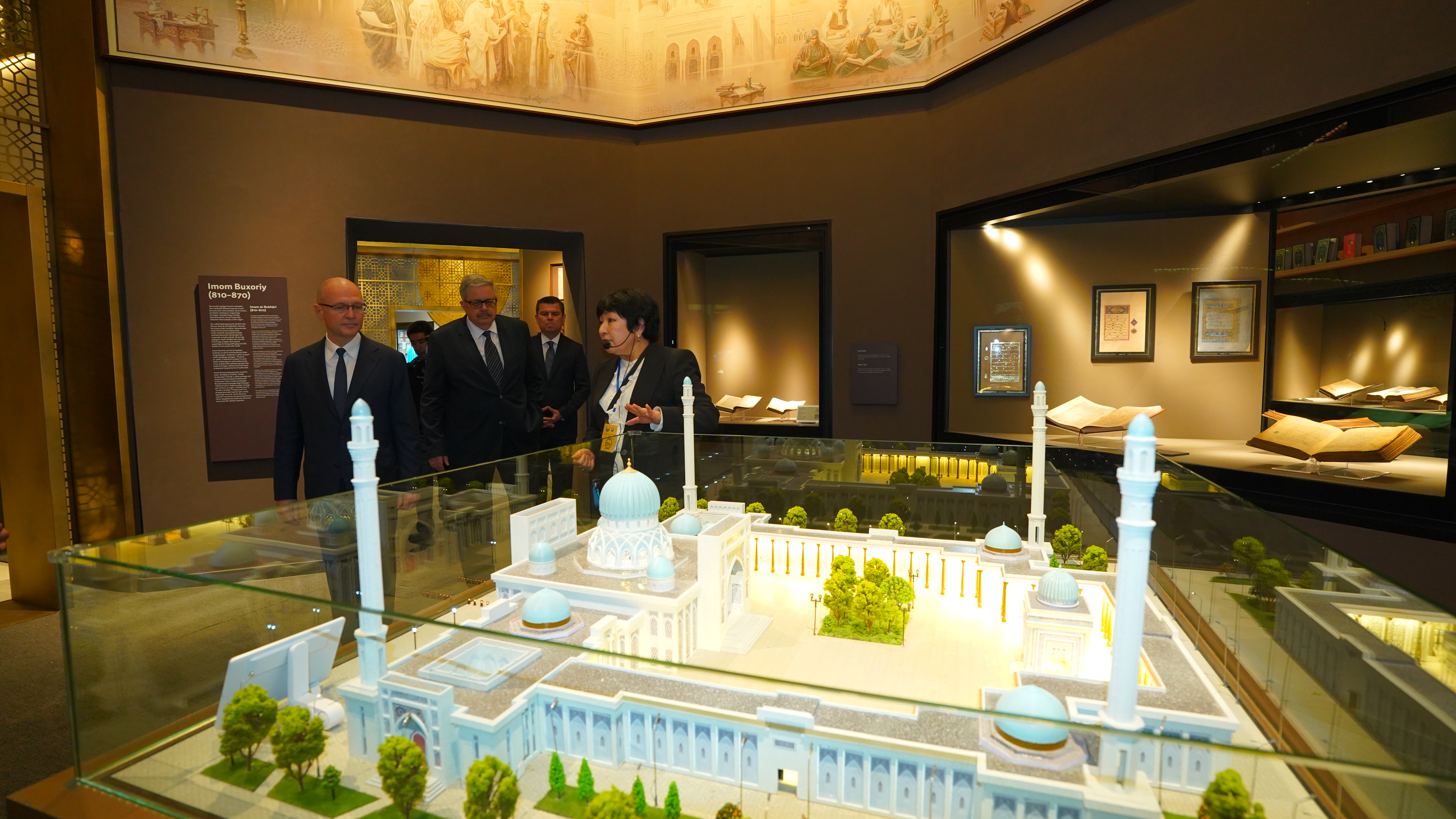 Также делегация ознакомилась с разделом, посвящённым Имаму аль-Бухари. Гости высоко оценили современный мемориальный комплекс, построенный неподалёку от Самарканда, и масштаб его развития.