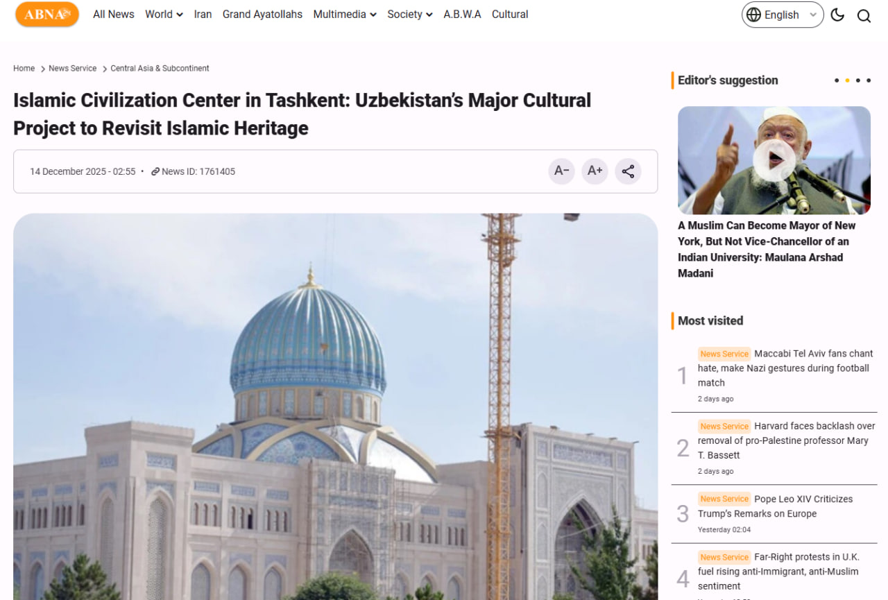Агентство новостей AhlulBayt (ABNA) осветило созданный в Узбекистане Центр исламской цивилизации как крупный культурно-просветительский проект, направленный на переосмысление исламского наследия и сохранение национальных историко-культурных ценностей.