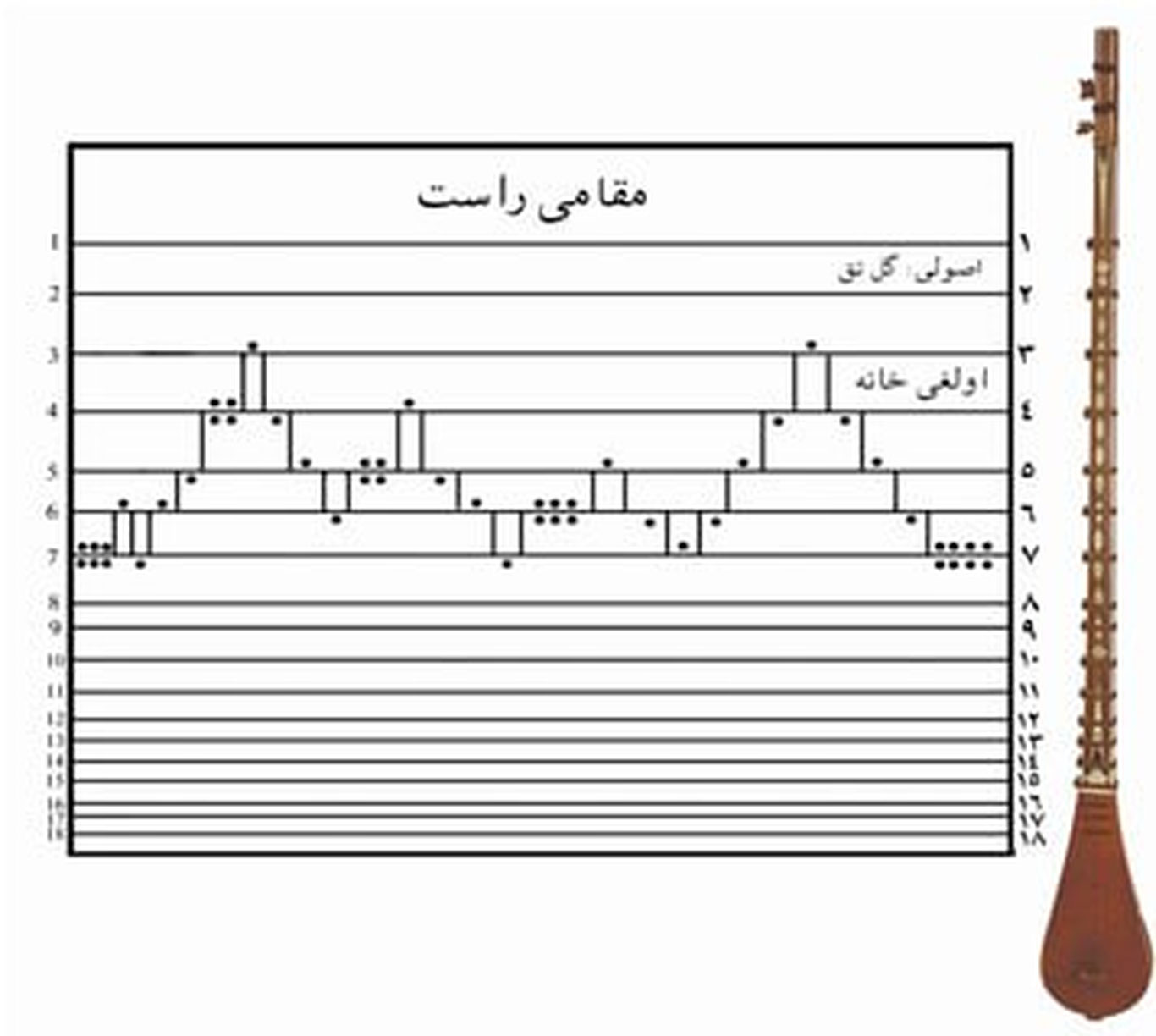 Komil Xorazmiy 1873–1874 yillarda “tanbur chizigʻi” nomli milliy nota yozuvini yaratdi. Uning asosiy xususiyatlari quyidagilar edi: