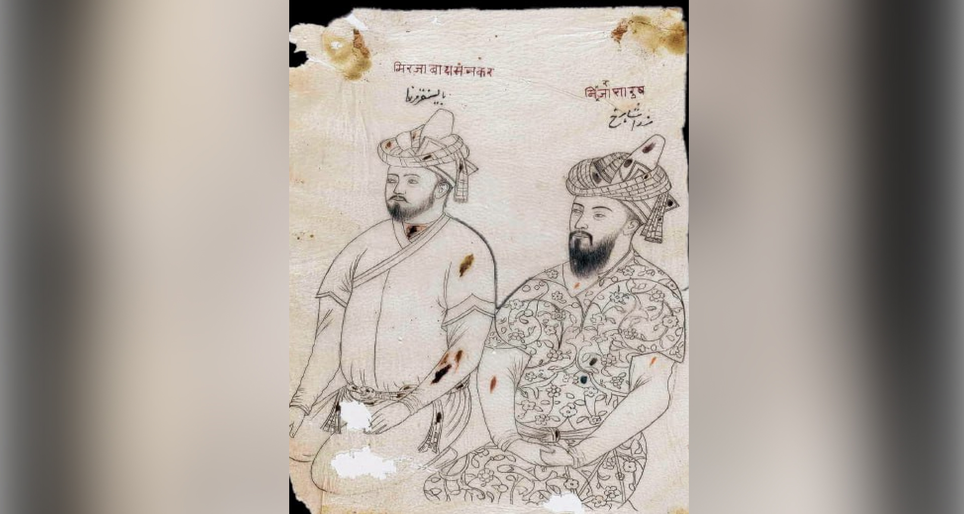 Ayvondan tashqaridagi chap tomonda Sulton Parviz, oʻng tomonda esa shahzoda Xusrav joy olgan. Oʻng tomonida Abu Bakr, Boysungʻur va Shohrux Mirzo tasvirlangan. Chap tomonda aylana boʻlib oʻtirgan besh shaxs – Bobur Mirzo, Umar Shayx Mirzo, Sulton Abu Said Mirzo, Sulton Muhammad Mirzo va Mironshohni bir safda koʻrish mumkin.