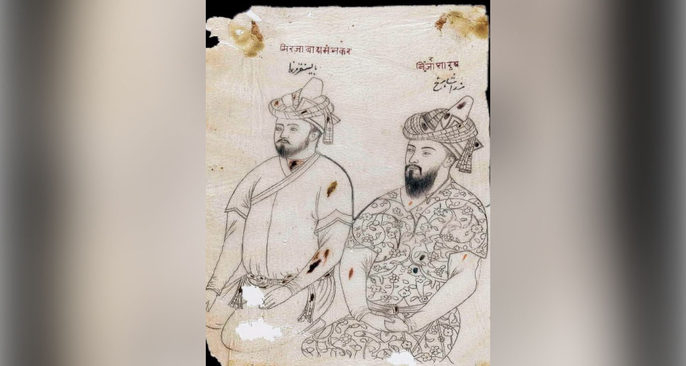 Bogʻ ayvonida oʻtirgan Humoyun Mirzo, uning qarshisida esa Akbar, Jahongir va Shohjahonlar tasvirlangan. Keyinchalik undagi yuz qiyofalarining koʻpchiligi qayta ishlangani, yaʼni boshqa Boburiy hukmdorlarni tasvirlash uchun yangidan boʻyalganligi haqida maʼlumotlar mavjud.